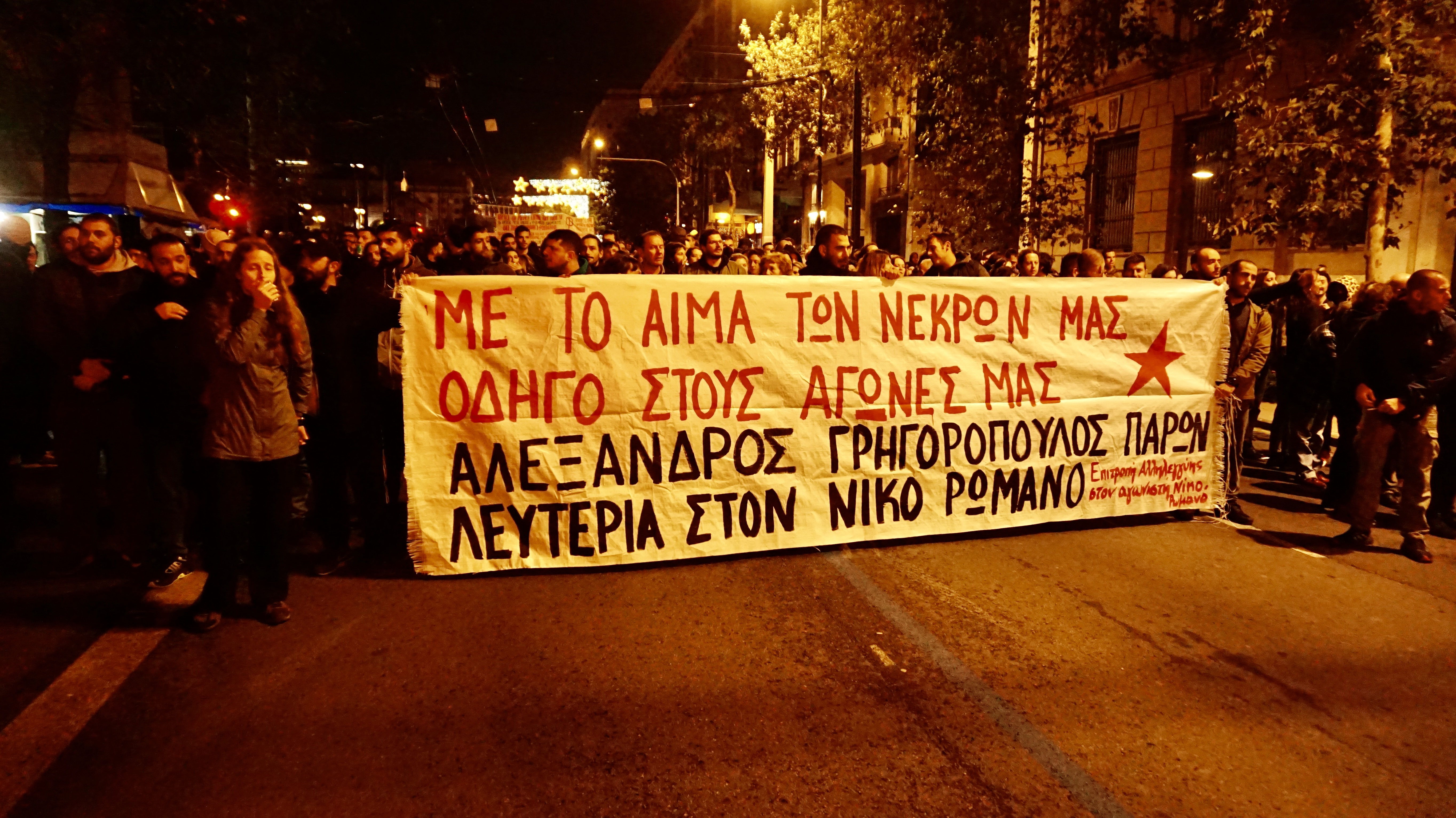 Πανό στην μεσημεριάτικη πορεία Αλέξη Γρηγορόπουλου στην Αθήνα. (φωτο Ε.Α.)
