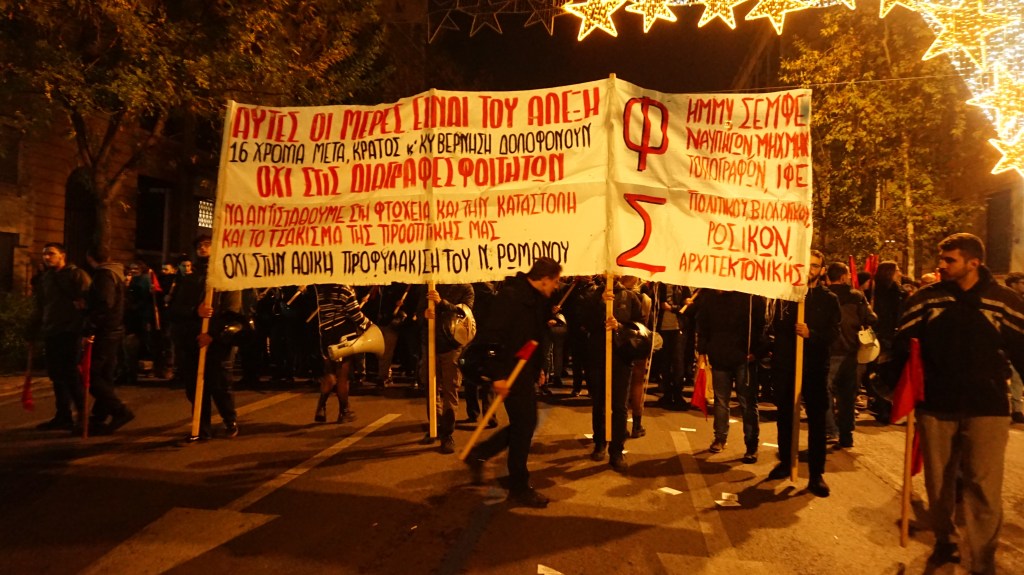 Από το φοιτητικό μπλοκ υπήρξαν συνθήματα κατά της αστυνομικής καταστολής, υπέρ του πανεπιστημιακού ασύλου, ενάντια στο νόμο διαγραφής φοιτητών κ.α.
