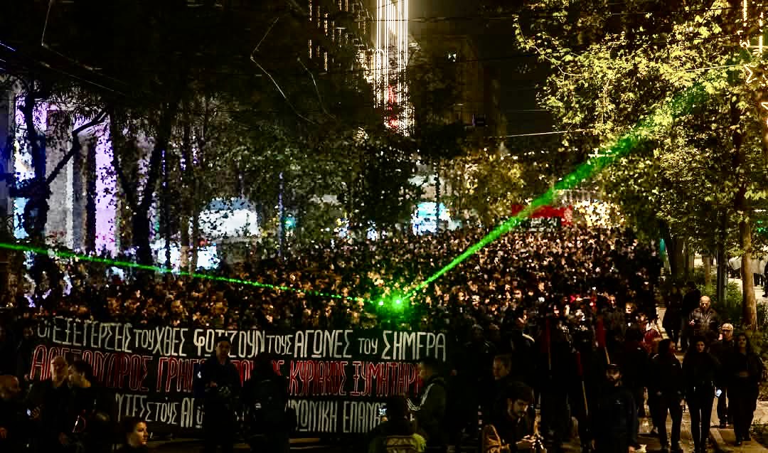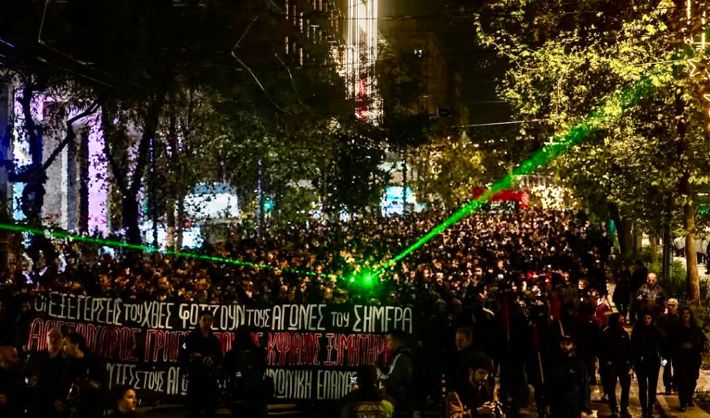 Πάνω από 10.000 νέοι/ες εργαζόμενοι/ες, φοιτητές/τριες και αντιπροσωπείες κομμάτων-οργανώσεων της Αριστεράς (πλην ΚΚΕ) συμμετείχαν στη χτεσινή (Παρασκευή βράδυ) μεγαλειώδη αντι-κυβερνητική αντι-αστυνομική πορεία της 16ης επετείου από τη δολοφονία του μαθητή Αλέξη Γρηγορόπουλου από αστυνομικό και της Εξέγερσης της Νεολαίας το Δεκέμβρη 2008.