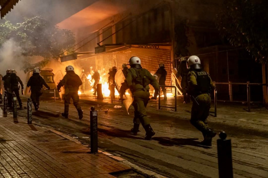 Μετά το τέλος της πορείας νεαροί και ΜΑΤ συγκρούστηκαν στην περιοχή Εξαρχείων. –