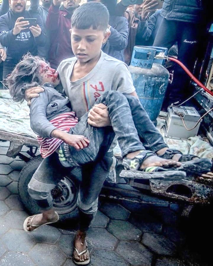Πατέρας μεταφέρει το πληγωμένο αγόρι του μετά από ισραηλινό βομβαρδισμό στη βόρεια Γάζα. (φωτο The News Line)