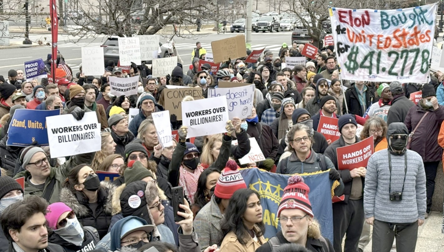 Εργάτες διαδηλώνουν στο Υπουργείο Εργασίας ΕΠΑ, Γουάσινγκτον 5 Φλεβάρη, ενάντια στις ενέργειες του οργανισμού DOGE του Ε. Μασκ να ελέγξει τα δεδομένα του Υπουργείου για μαζικές απολύσεις. (φωτο Kena Betancur)