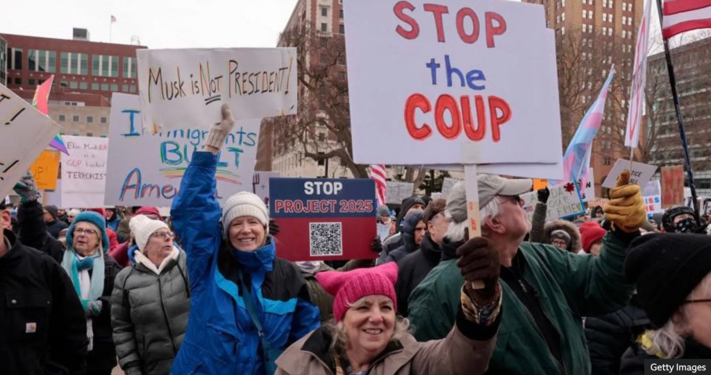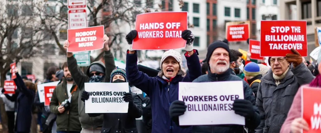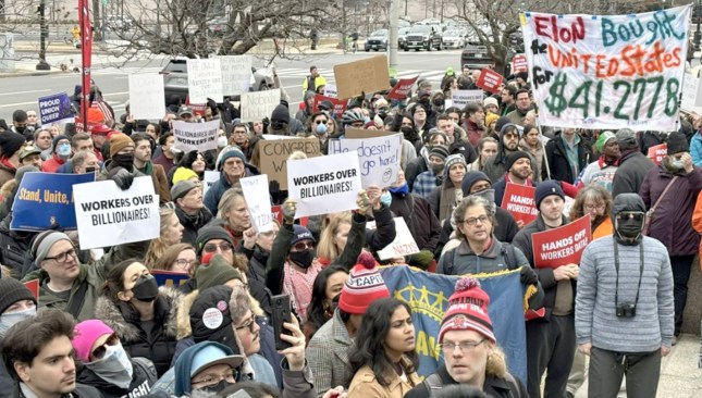 Αμερικανοί εργαζόμενοι διαδήλωσαν στις 5 Φλεβάρη 2025 και στις 50 Πολιτείες των ΕΠΑ ενάντια στο “πραξικόπημα” των Τραμπ – Μασκ που σκοπεύουν να απολύσουν εκατοντάδες χιλιάδες δημοσίους υπαλλήλους. (φωτο Getty)