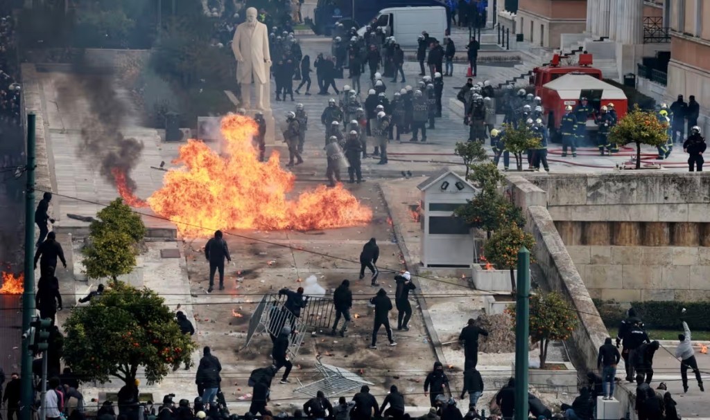 Τότε ξεκίνησαν συγκρούσεις νεαρών και ΜΑΤ στο προαύλιο της Βουλής, στη γωνία Βασ. Σοφίας και Βασ. Αμαλίας, καθώς οι νεαροί πέταξαν μολότοφ και τα ΜΑΤ χημικά. Οι συγκρούσεις επεχτάθηκαν καθώς ο κόσμος έξω από τη Βουλή φώναζε “δολοφόνοι, δολοφόνοι!” και “Κάτω η Νέα Δημοκρατία”.