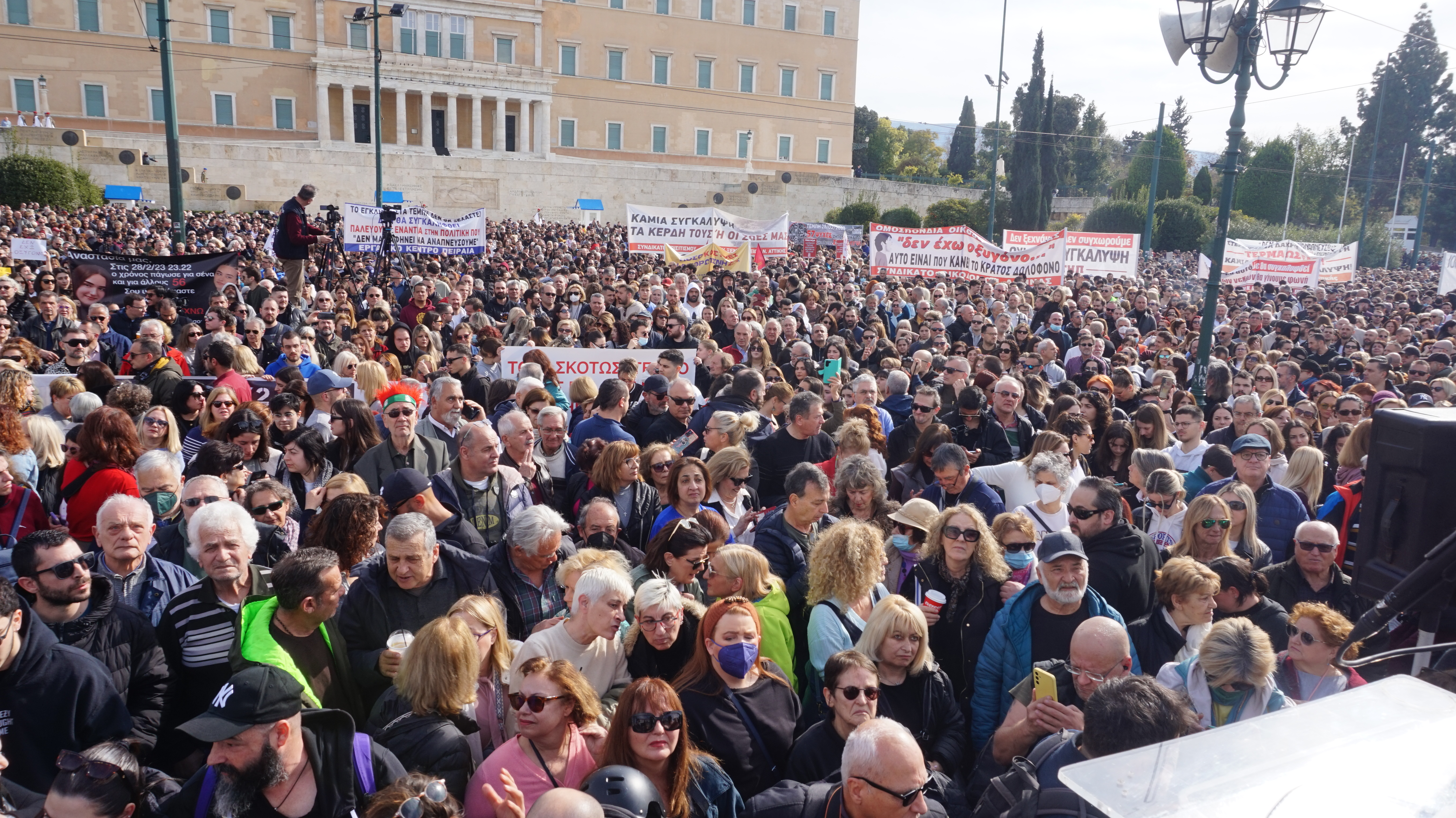 Πολλές εκατοντάδες χιλιάδες εργαζομένων, νεολαίας, συνταξιούχων και επαγγελματιών κατέκλυσαν το ευρύτερο κέντρο της Αθήνας σήμερα το μεσημέρι στη συγκέντρωση τής 24ωρης Γενικής Απεργίας, στη δεύτερη επέτειο του εγκλήματος στα Τέμπη.
