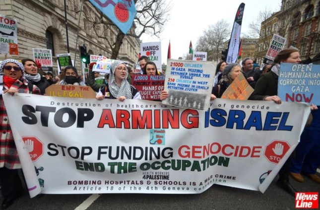Από την τεράστια πορεία στο Λονδίνο, 15/2/25, ενάντια στον εξοπλισμό του Ισραήλ από την κυβέρνηση Εργατικού Κόμματος του Πρωθυπουργού Κ. Στάρμερ που ηγείται σήμερα της “Συμμαχίας Προθύμων” για πόλεμο με τη Ρωσία. (φωτο The News Line)