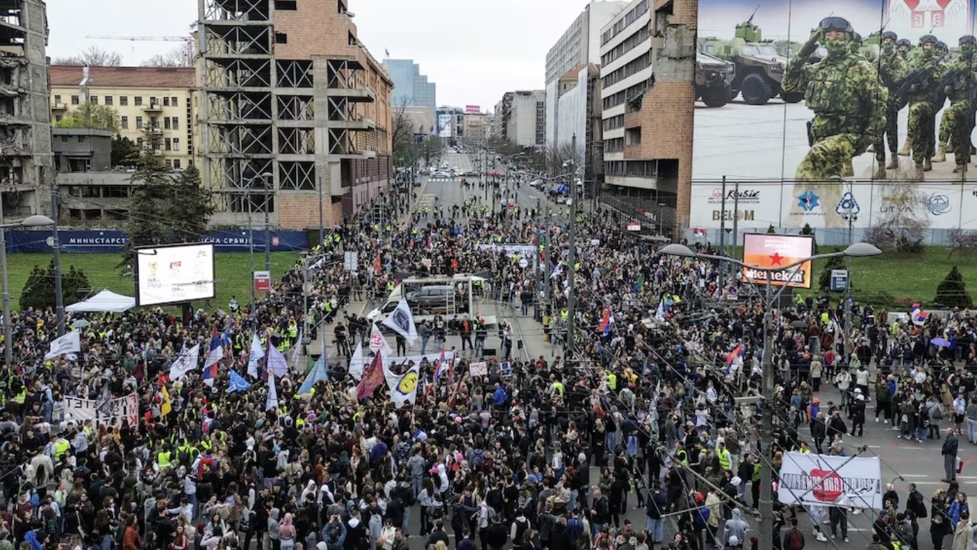 Συγκέντρωση έξω από τα πρώην στρατηγείο του Σερβικού Στρατού στο Βελιγράδι που οργάνωσαν φοιτητές του πανεπιστημίου χτες Δευτέρα 24/3, στην 26η επέτειο των βομβαρδισμών του ΝΑΤΟ ενάντια στη Γιουγκοσλαβία που υποστηρίχτηκε από τη Ρωσία του Μπορίς Γιέλτσιν. Εταιρεία του γαμπρού του Τραμπ θέλει να αγοράσει το στρατηγείο για μετατροπή του σε ξενοδοχείο. (φωτο Djordje Kojadinovic)