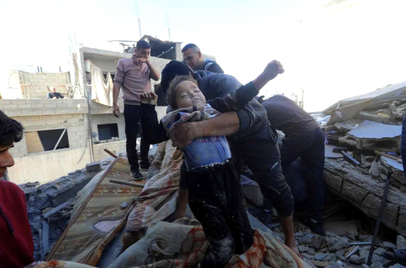 Διασώστες βγάζουν ένα παιδί από τα συντρίμμια μιας κατοικίας στη συνοικία Σάμπρα, της πόλης της Γάζας, μετά από βομβαρδισμό των Ισραηλινών στις 20/3. (φωτο The News Line)