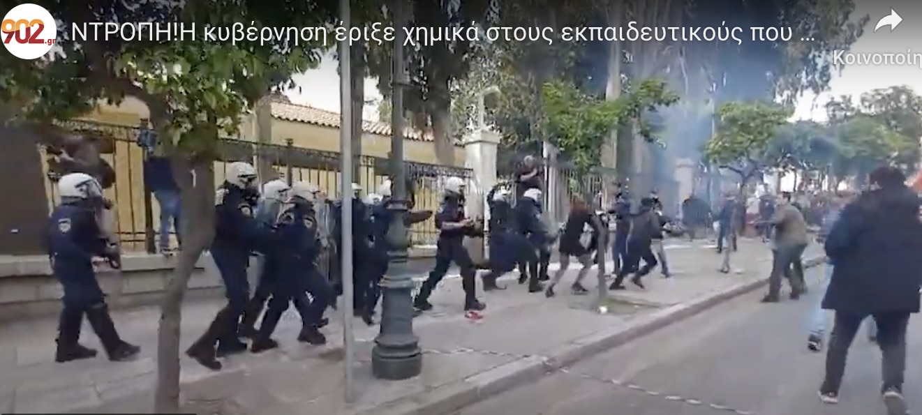 Από την επίθεση με χημικά και γκλομπ των πάνοπλων ΜΑΤ στην πορεία των εκπαιδευτικών σήμερα Σάββατο στην οδό Ηρώδη Αττικού. (φωτο από βίντεο σε 902.gr)