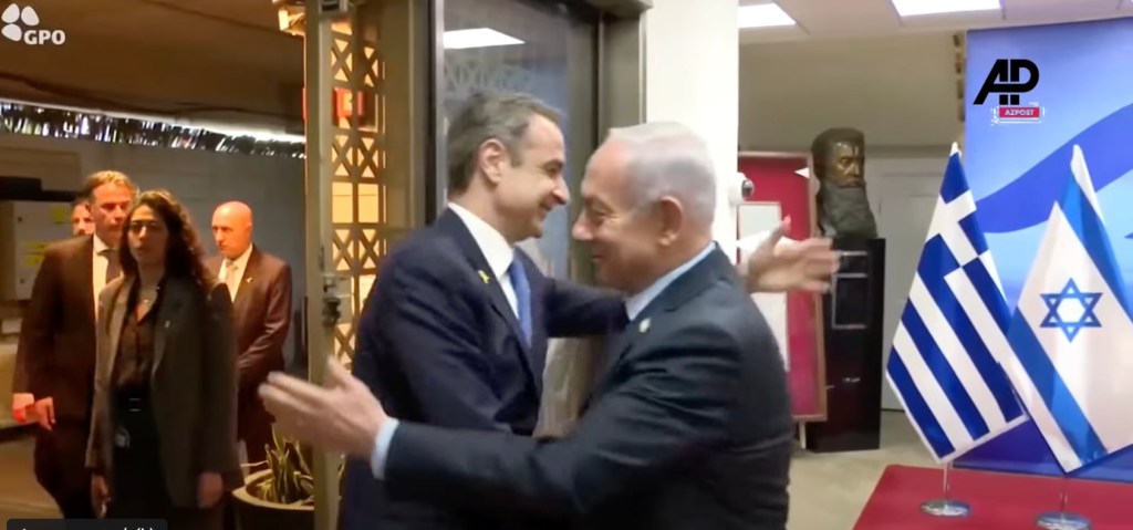 Αλ Κουντς/Ιερουσαλήμ, Κυριακή: “Νετανιάχου: Καλώς όρισες καλέ μου φίλε Κυριάκο. – Μητσοτάκης: Είναι πάντα ευχαρίστησή μου να βρίσκομαι εδώ και να συζητώ μαζί σου”. (φωτό από βίντεο AP)