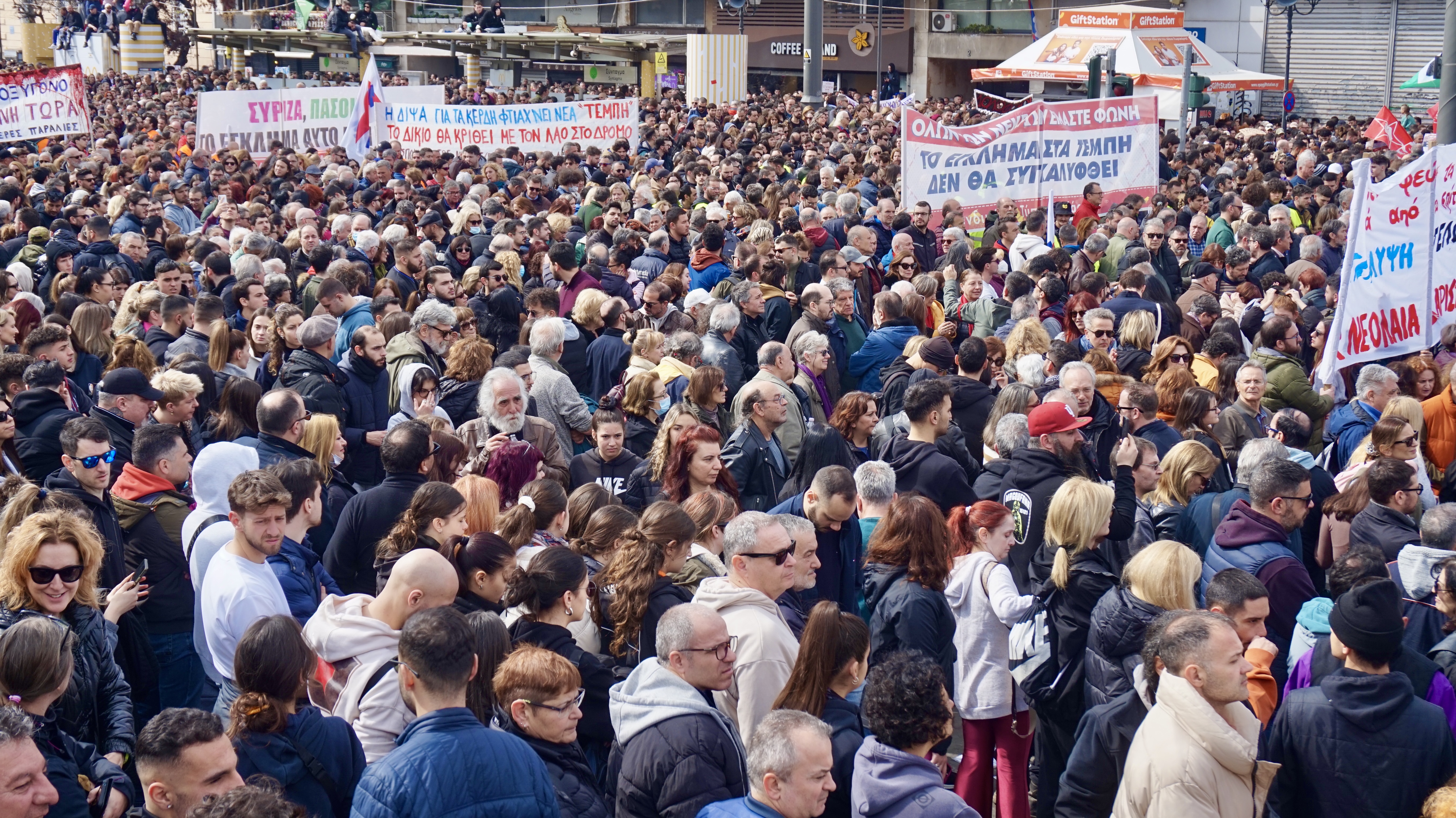 Περίπου 40.000 εργαζόμενοι, συνδικαλιστές, φοιτητές και νεολαία συμμετείχαν στη χτεσινή (Τετάρτη βράδυ) συγκέντρωση έξω από τη Βουλή και στους γύρω δρόμους που οργάνωσαν τα Εργατικά Κέντρα Αθήνας και Πειραιά και εργατικές ομοσπονδίες, που υποστηρίζουν την πολιτική ΠΑΜΕ – ΚΚΕ, με κεντρικό σύνθημα “τα κέρδη τους ή οι ζωές μας!” για το έγκλημα στα Τέμπη.