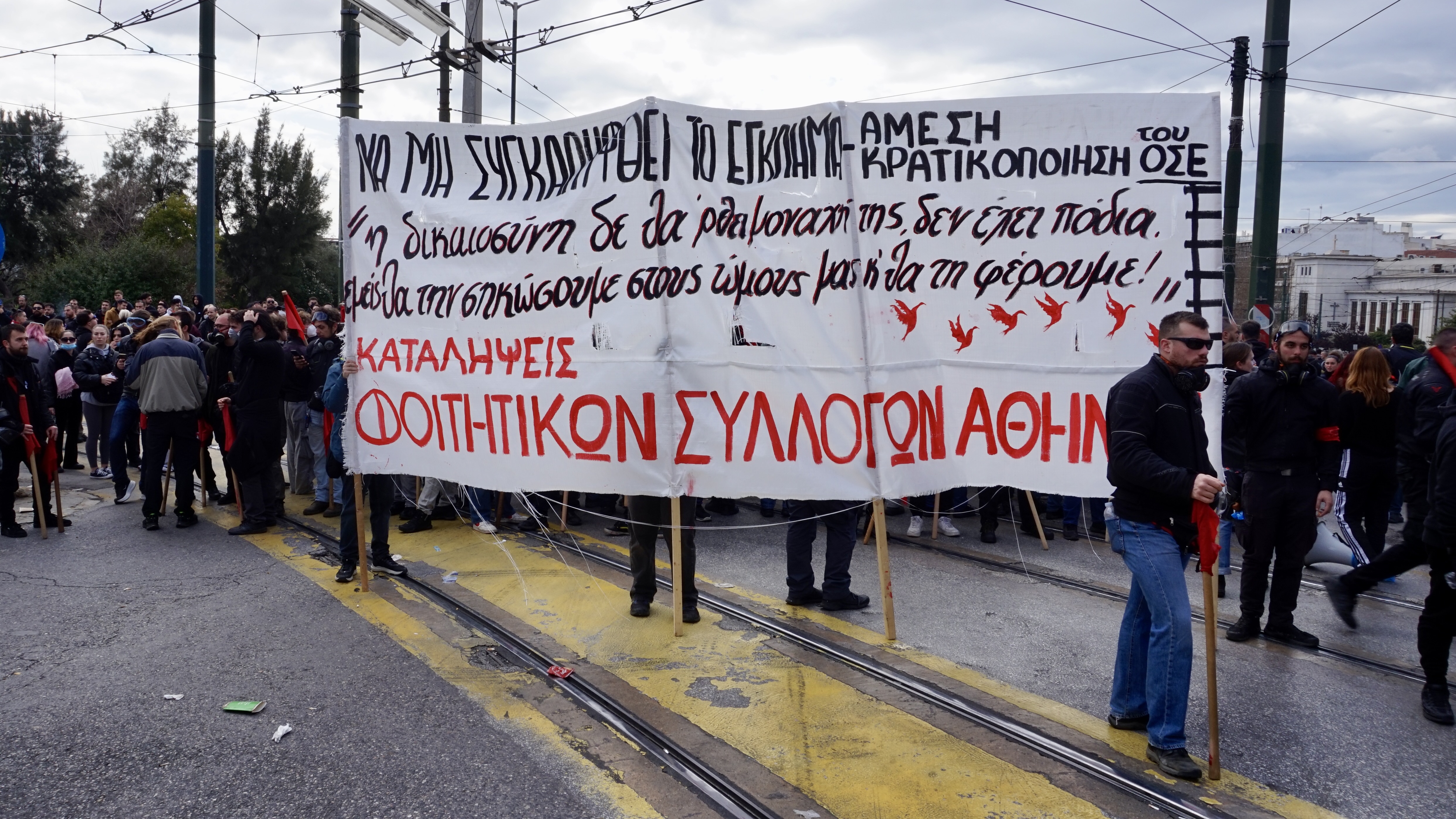 Το πανό των καταλήψεων φοιτητικών συλλόγων Αθήνας μπροστά στη Βουλή για πορεία προς τα Προπύλαια με συνθήματα ανατροπή κυβέρνησης συγκάλυψης, τέρμα στις ιδιωτικοποιήσεις και άμεση κρατικοποίηση του σιδηροδρόμου. (φωτο Ε.Α.)