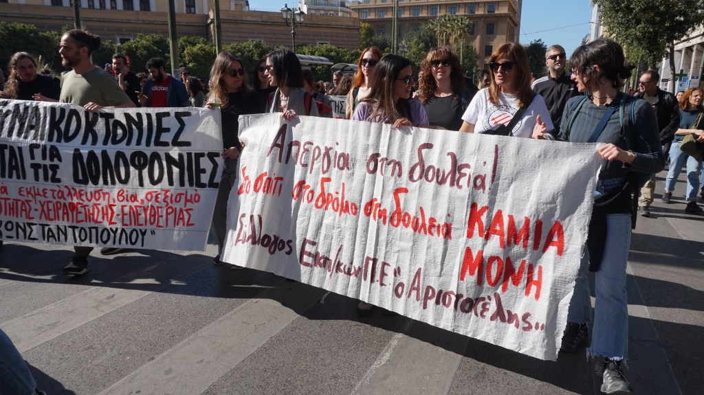 Μαχητικά πανό και μαχητικοί εκπαιδευτικοί στη σημερινή (Σάββατο 29/3) πορεία στην Αθήνα ενάντια στις διώξεις της χούντας Μητσοτάκη. (φωτο Ε.Α.)