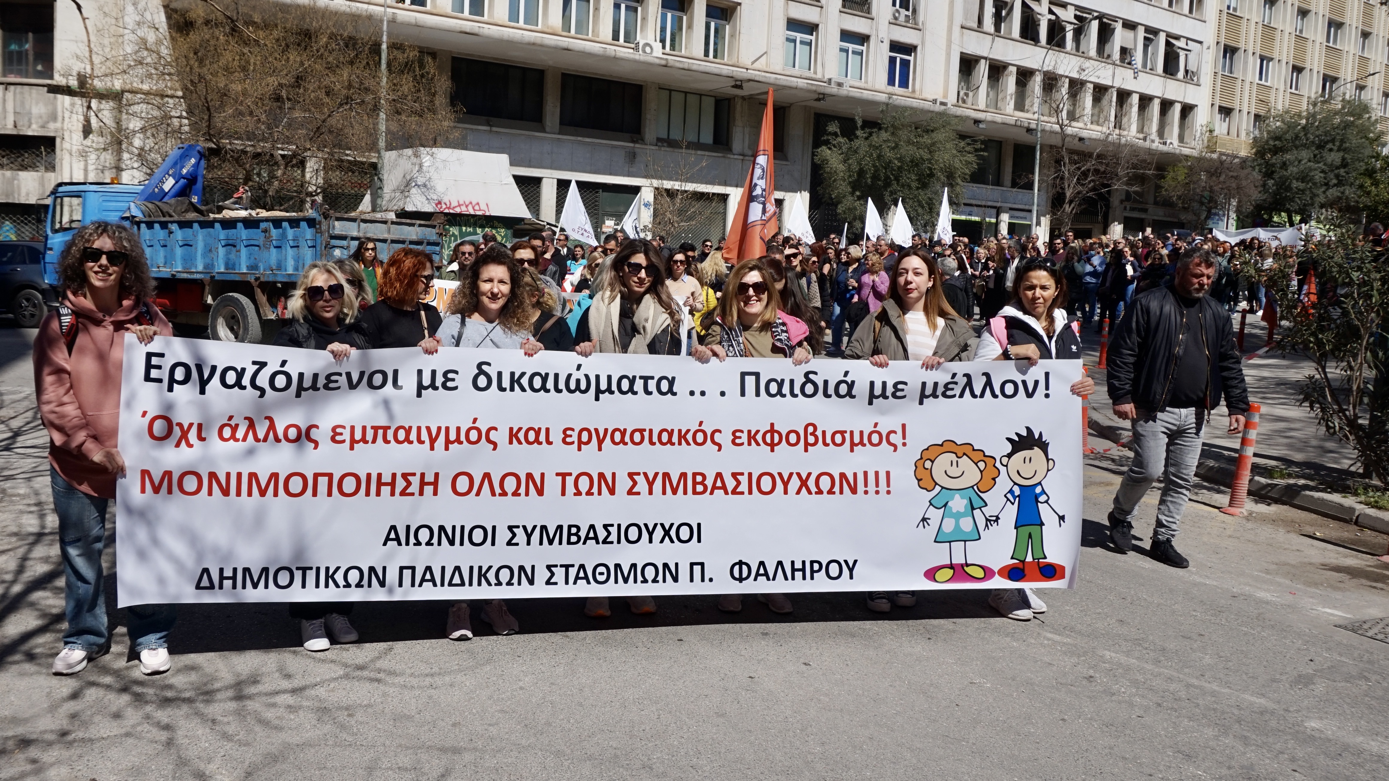 Το πανό των συμβασιούχων δημοτικών παιδικών σταθμών δήμου Παλαιού Φαλήρου στην απεργιακή πορεία της Παρασκευής. (φωτο Ε.Α.)