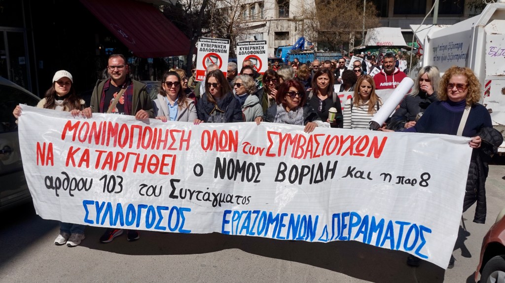 Το πανό του Συλλόγου Εργαζομένων Δήμου Περάματος στην πορεία της Παρασκευής 21/3 στην Αθήνα που κάλεσε η ΠΟΕ-ΟΤΑ. (φωτο Ε.Α.)
