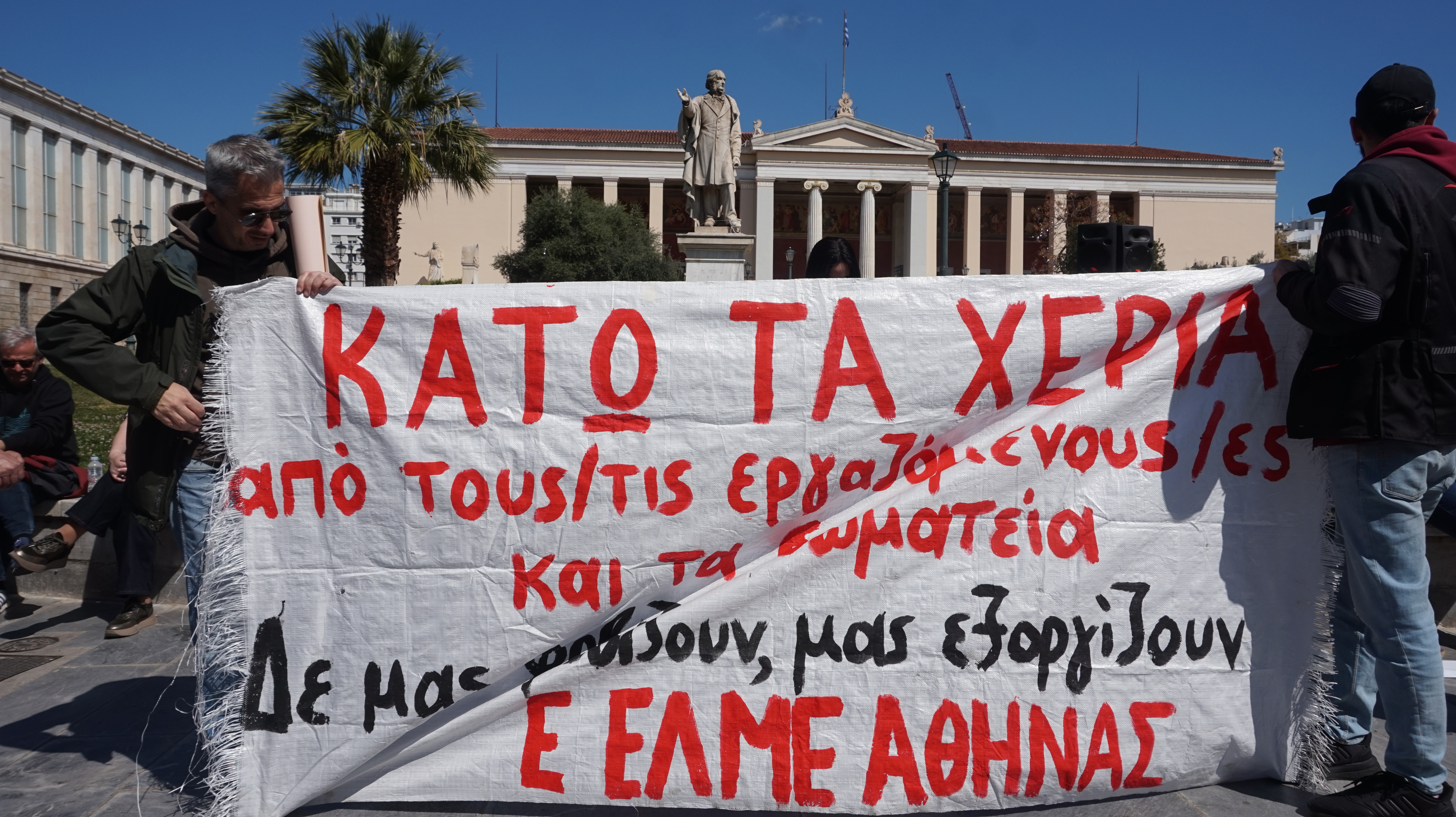 “Κάτω τα χέρια από Χρύσα και Δημήτρη” πανό στην απεργιακή συγκέντρωση Προπύλαια 21/3. (φωτο Ε.Α.)