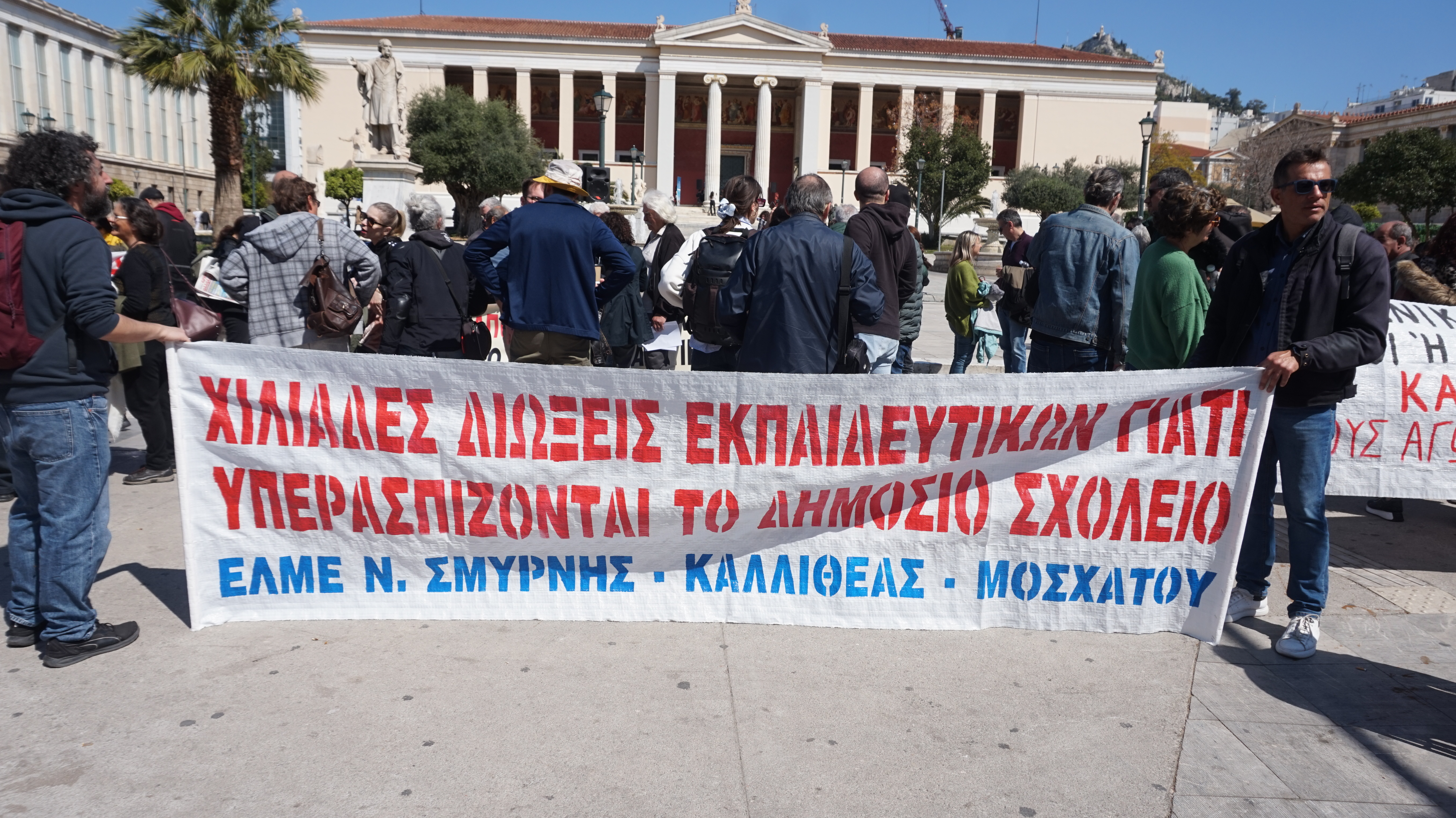 Εκατοντάδες εκπαιδευτικοί από συλλόγους πρωτοβάθμιας και δευτεροβάθμιας εκπαίδευσης πραγματοποίησαν μαχητική απεργιακή συγκέντρωση στα Προπύλαια και πορεία στη Βουλή την Παρασκευή (21/3) μεσημέρι ενάντια στις χιλιάδες διώξεις εκπαιδευτικών και τής επίθεσης στο δημόσιο σχολείο από το Υπουργείο Παιδείας τής κοινοβουλευτικής χούντας Μητσοτάκη.