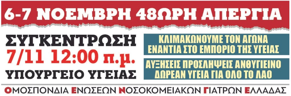 Νοσοκομειακοί και γιατροί στα δημόσια νοσοκομεία κατεβαίνουν σε πανελλαδικές απεργίες Πέμπτη και Παρασκευή 6-7 Νοέμβρη ενάντια στη διάλυση του ΕΣΥ και διεκδικώντας μονιμοποίηση όλων των εργαζομένων και μαζικές προσλήψεις γιατρών και προσωπικού.