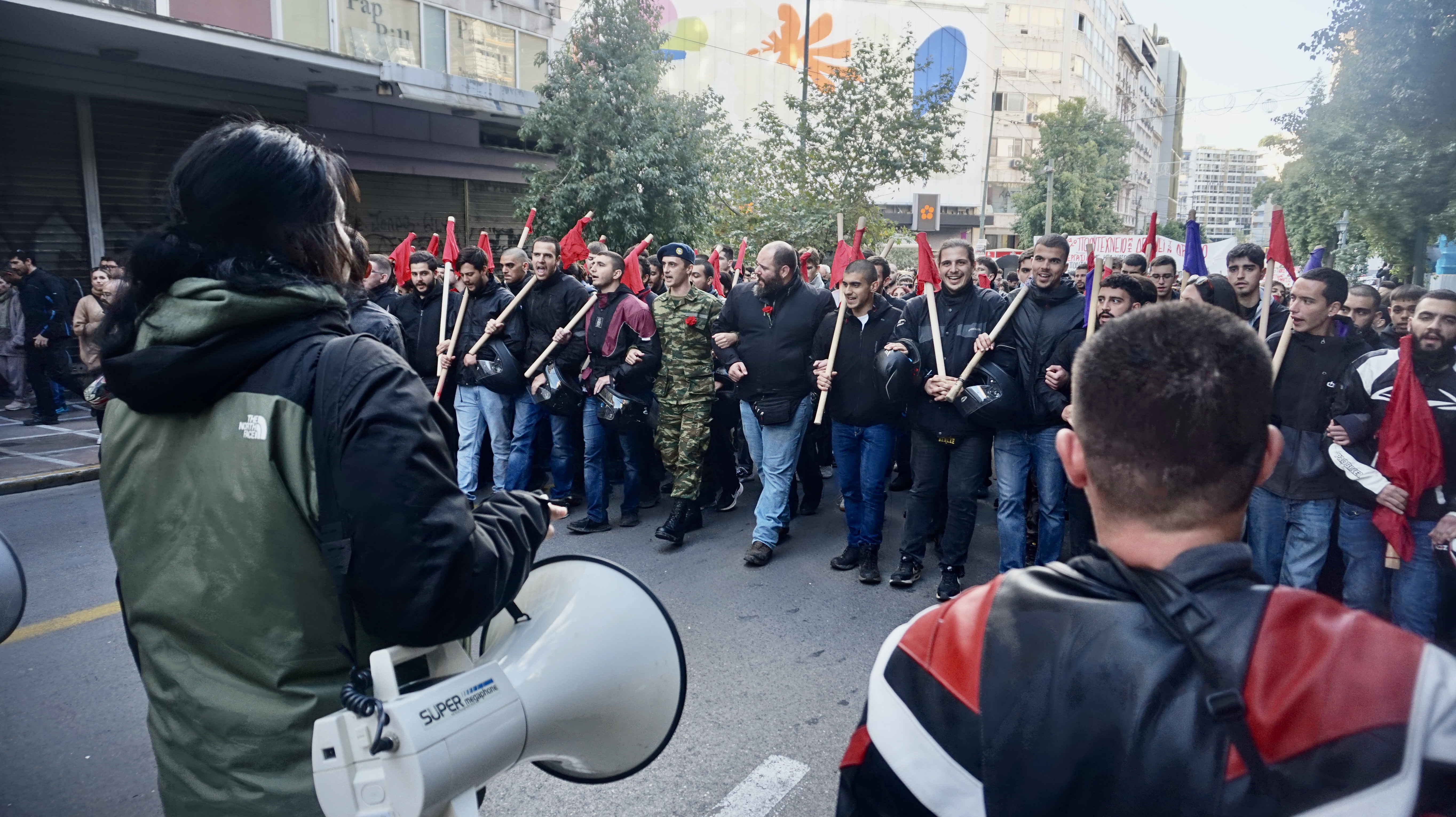 Από την Πανεπιστημίου ακολούθησε την πορεία η πολύ μεγάλη διαδήλωση ΚΝΕ-ΠΑΜΕ-ΚΚΕ με μπροστά πανό φοιτητικών συλλόγων που ανάφερε “Το Πολυτεχνείο Ζει! Με οργάνωση και αγώνα για την ανατροπή – στο σύστημα του κέρδους καμιά υποταγή!”. Το συνθήματα ήταν κατά του αμερικάνικου ιμπεριαλισμού και της ΕΕ αλλά ούτε λέξη για αγώνα ανατροπής της χούντας Μητσοτάκη.