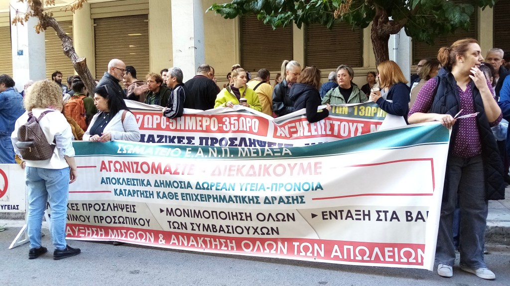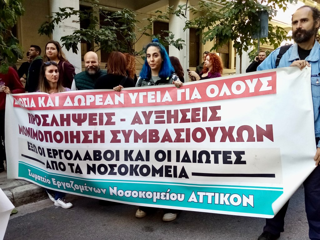 Λίγες εκατοντάδες εργαζόμενοι/ες και γιατροί στα δημόσια νοσοκομεία και στο ΕΣΥ συμμετείχαν στις απεργιακές κινητοποιήσεις χτες Πέμπτη και σήμερα Παρασκευή μεσημέρι στο Υπουργείο Υγείας διεκδικώντας ικανή χρηματοδότηση της δημόσιας υγείας και νοσοκομείων, προσλήψεις, μονιμοποίηση των συμβασιούχων, αυξήσεις μισθών, καλύτερες συνθήκες δουλειάς ενάντια στο πρόγραμμα διάλυσης και ιδιωτικοποίησης ΕΣΥ της χούντας Μητσοτάκη.