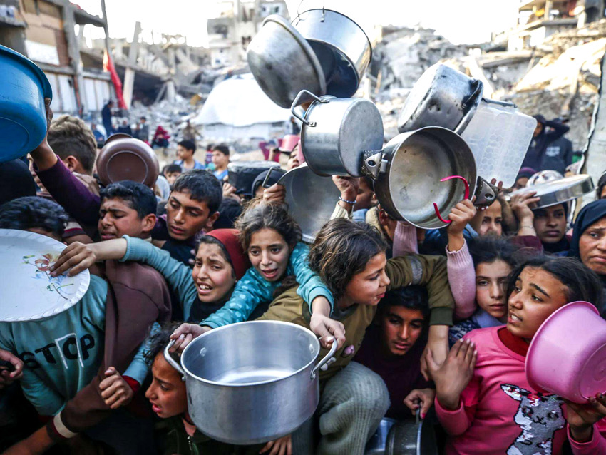 Πεινασμένα παιδιά στη Γάζα ζητούν φαγητό από ανθρωπιστική οργάνωση. (φωτο The News Line)