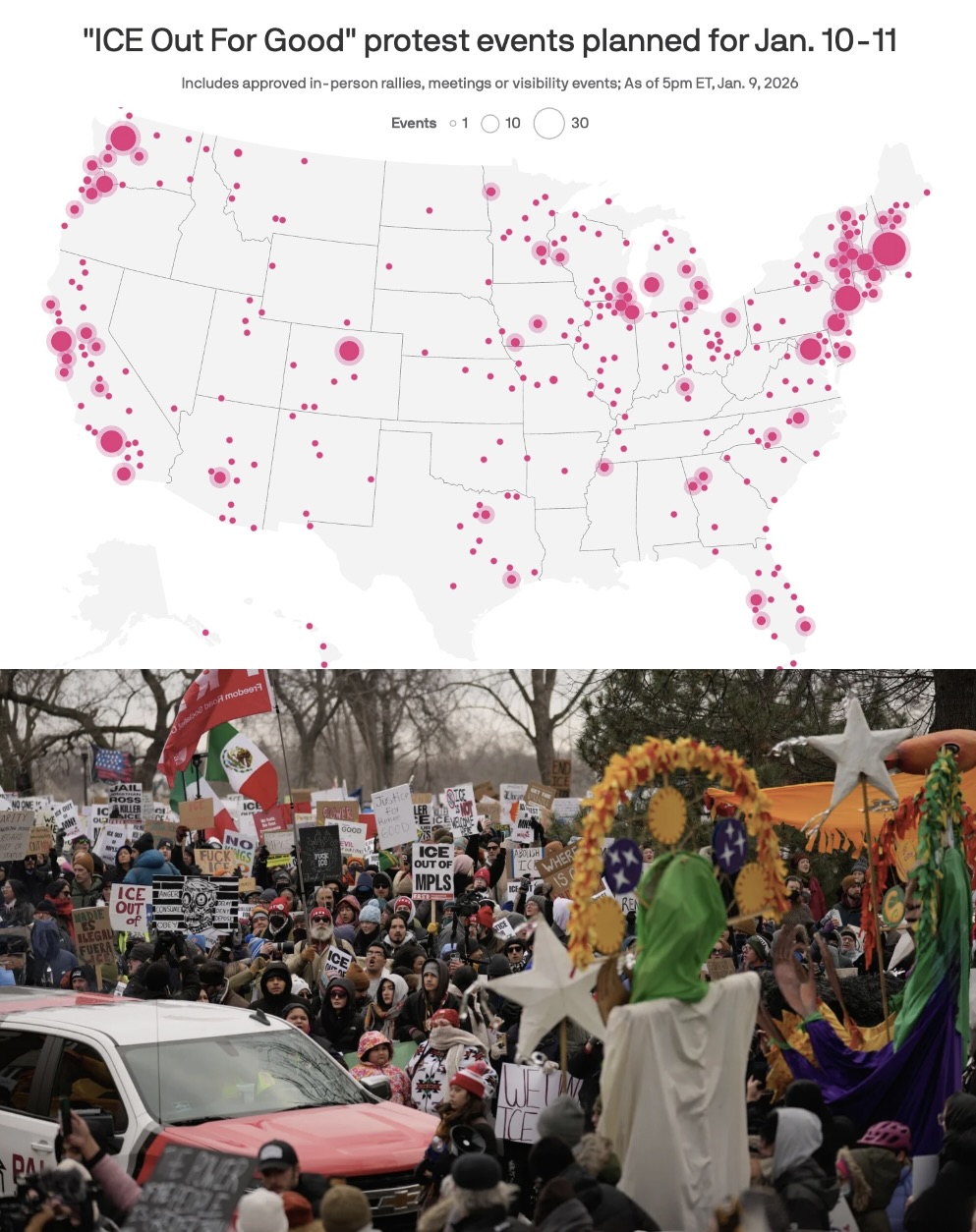 Οι διαδηλώσεις στις ΕΠΑ το περασμένο Σαββατοκύριακο (γράφημα Axios) και η τεράστια διαδήλωση το Σάββατο στη Μινεάπολη μετά τη δολοφονία της Γκουντ από την Γκεστάπο-ICE του Τραμπ. (φωτο ΑΠ)