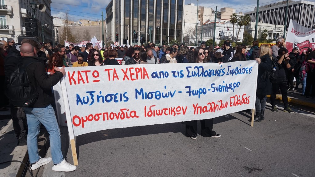 Πάνω από 2.500 εργαζόμενοι/ες συμμετείχαν στη χτεσινή απεργιακή συγκέντρωση έξω από τη Βουλή, που είχαν καλέσει με μια μόνο 4ωρη στάση εργασίας (!) τα Εργατικά Κέντρα Αττικής – που υποστηρίζουν την πολιτική του ΠΑΜΕ – ενάντια στο νομοσχέδιο για τις ΣΣΕ που ψηφίστηκε στη Βουλή από 158 βουλευτές τής ΝΔ και των συμμάχων της. (φωτο Ε.Α.)
