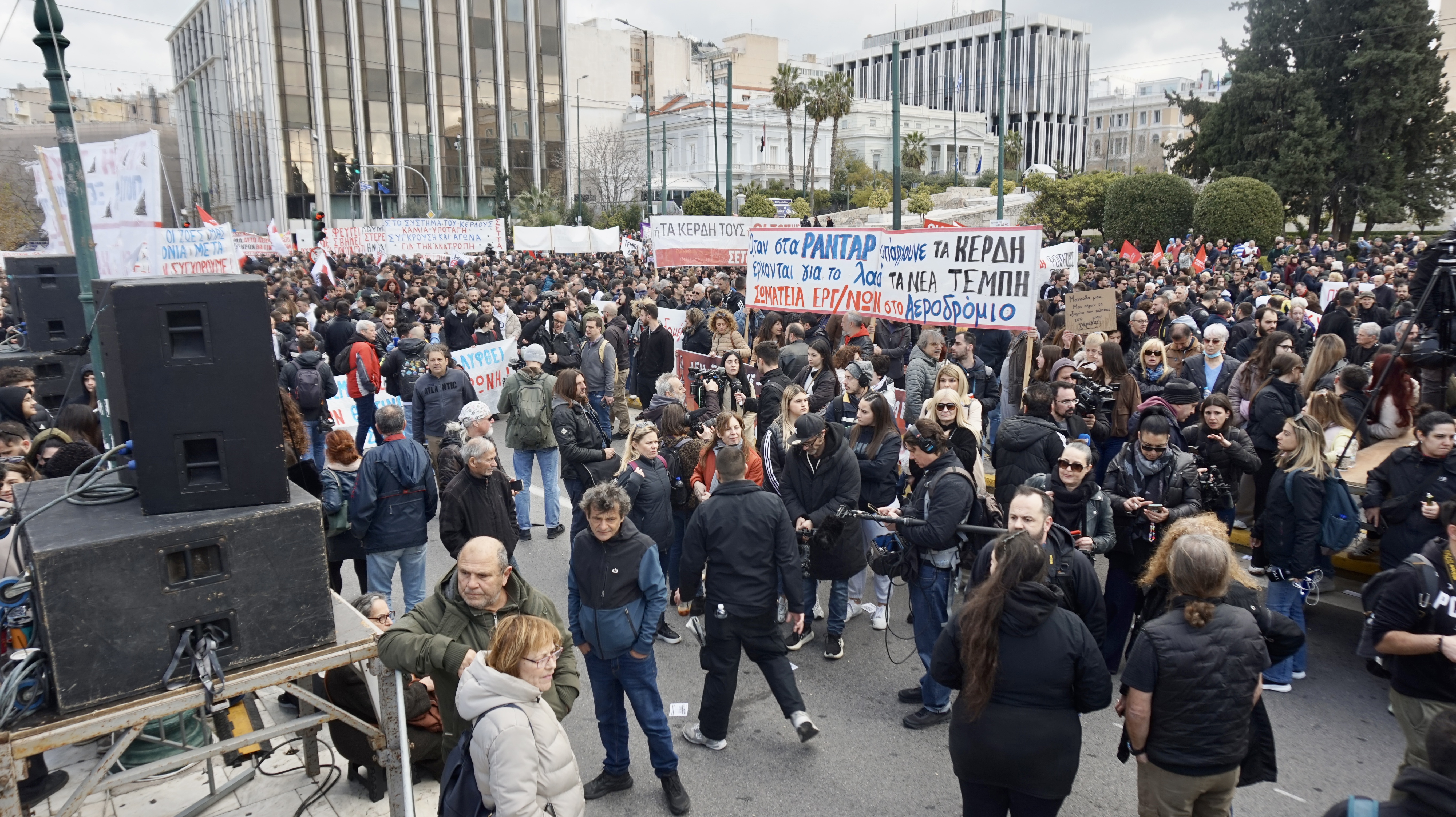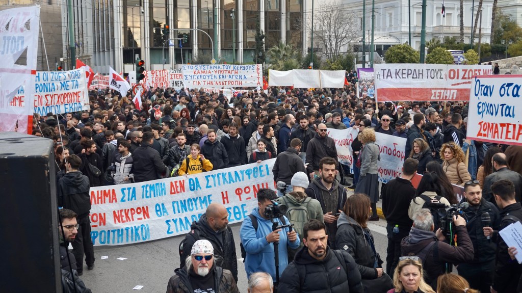 Δεκάδες χιλιάδες εργαζόμενοι/ες και νεολαία συμμετείχαν στη σημερινή ιστορική μεγαλειώδη και οργισμένη συγκέντρωση έξω από τη Βουλή στα τρία χρόνια από το έγκλημα στα Τέμπη για να εκφράσουν το ταξικό μίσος τους στην κοινοβουλευτική χούντα Μητσοτάκη.