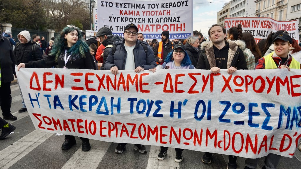Εργαζόμενοι/ες στα McDonald’s με το πανό τους στη σημερινή συγκέντρωση στη Βουλή. Η νεολαία, φοιτητές και οι εικοσάρηδες και τριαντάρηδες εργαζόμενοι/οι ήταν η μεγάλη πλειοψηφία στη συγκέντρωση. (φωτο Ε.Α.)