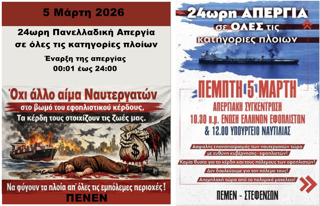 “Να γυρίσουν τώρα ασφαλείς οι ναυτεργάτες που είναι εγκλωβισμένοι στον Περσικό Κόλπο! Οι ναυτεργάτες δεν δουλεύουν για τον πόλεμο! Έξω τώρα η χώρα από το ιμπεριαλιστικό μακελειό”.