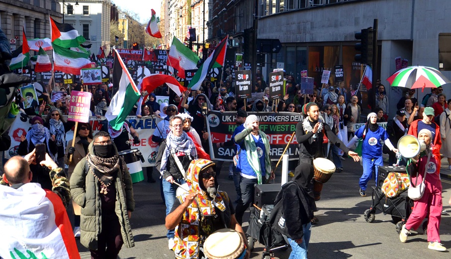 Από τη διαδήλωση 10.000 στο Λονδίνο το περασμένο Σάββατο υπέρ της Παλαιστίνης και του Ιράν με κύριο σύνθημα “Κάτω τα χέρια από το Ιράν”. (φωτο The News Line)