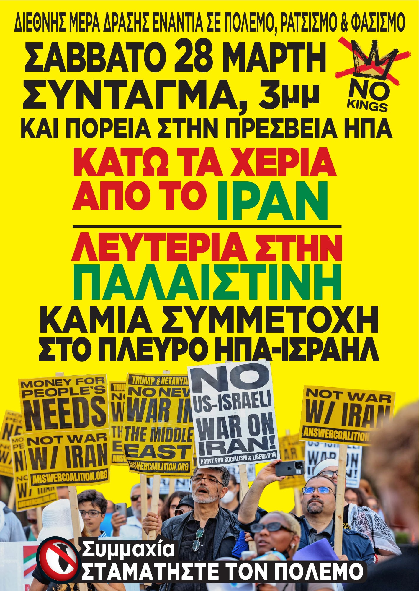 Οι ηγεσίες ΚΚΕ και ΠΑΜΕ καλούν σε πορείες απλής διαμαρτυρίας χωρίς να αγωνίζονται για την ανατροπή της μισητής χούντας Μητσοτάκη. Χτες Παρασκευή το ΚΚΕ οργάνωσε αντιπολεμική πορεία στην Αμερικανική Πρεσβεία στην Αθήνα με κεντρικό σύνθημα, “Έξω η Ελλάδα από τον πόλεμο, δεν θα πληρώσουμε εμείς τα σπασμένα! Κλείστε τις βάσεις”, χωρίς καμιά απολύτως αναφορά στο Ιράν. Το ΚΚΕ αρνείται να ξεστομίσει τη λέξη Ιράν!
