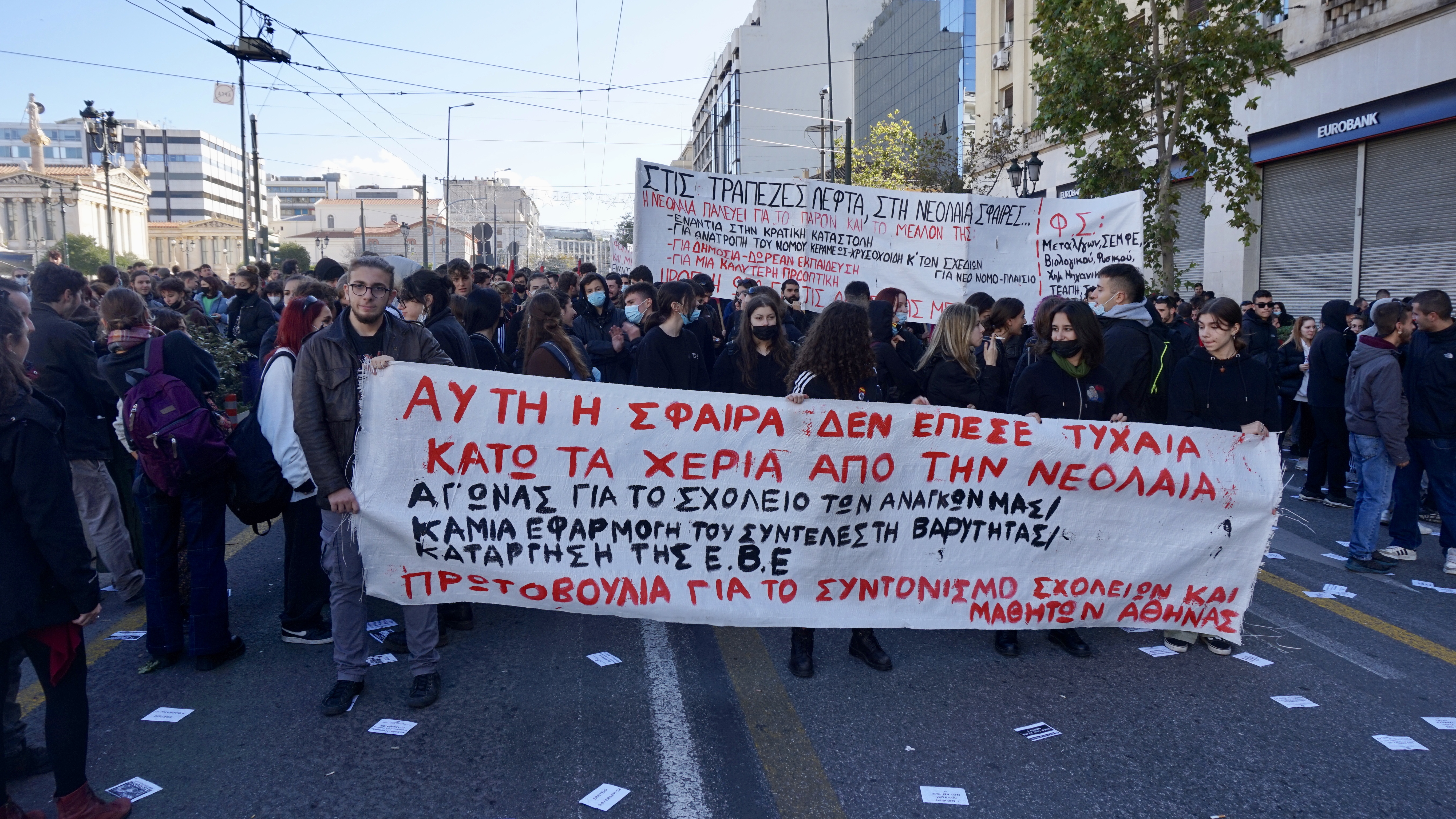 Από τη μεσημεριάτικη πορεία 1.500 μαθητών και φοιτητών στην Αθήνα με συνθήματα ενάντια στην κρατική τρομοκρατία και στη βια και δολοφονίες της αστυνομίας. Φωτό Ε.Α.