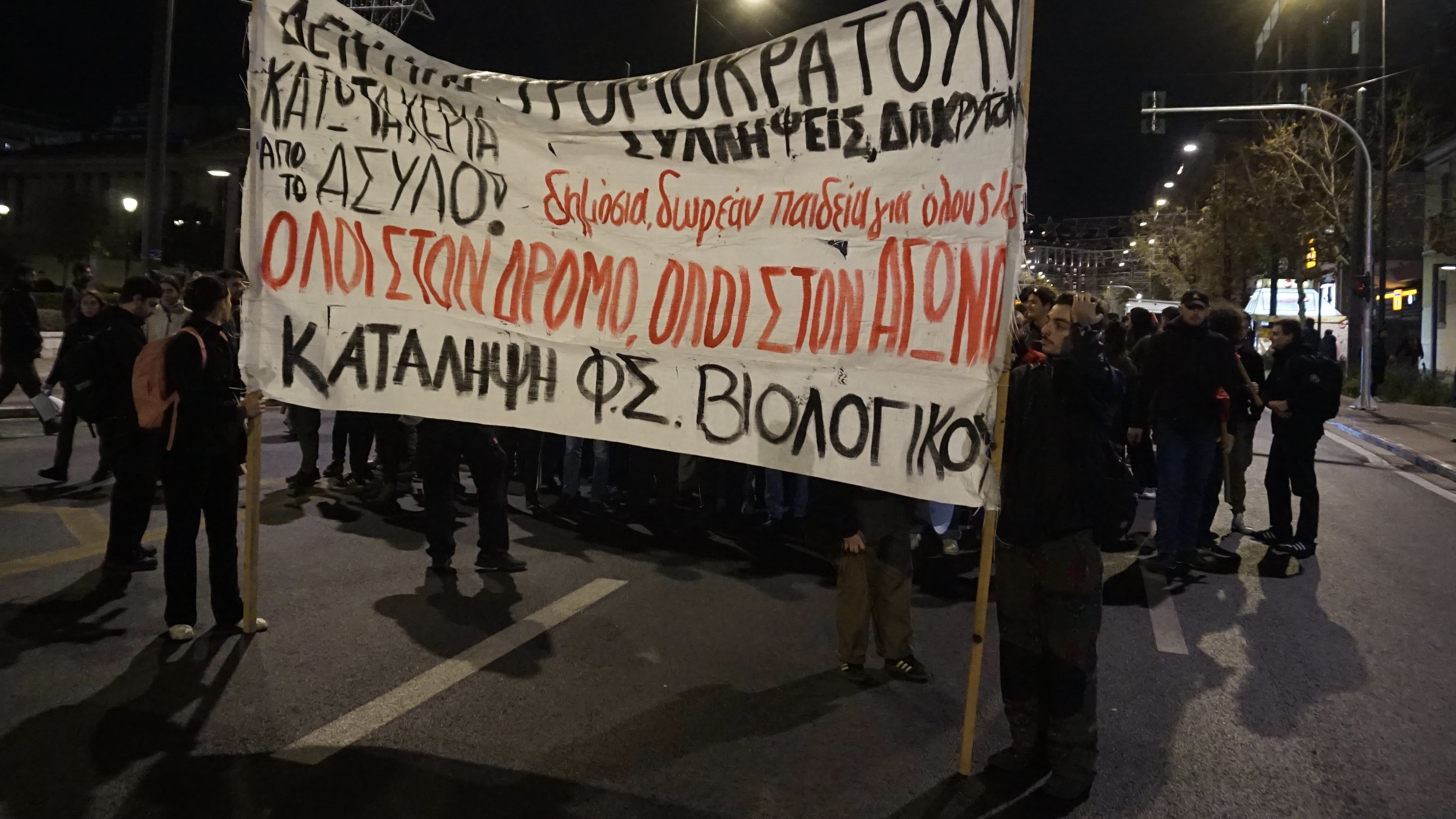 Χτες το βράδυ στο κέντρο της Αθήνας ο ΦΣ Βιολογικού οργάνωσε πορεία διαμαρτυρίας ενάντια στη βία των ΜΑΤ με συμμετοχή 400 φοιτητών/φοιτητριών και πανό που ανάφερε «Δεν μας τρομοκρατούν συλλήψεις δακρυγόνα – Δημόσια δωρεάν παιδεία για όλους/ες».