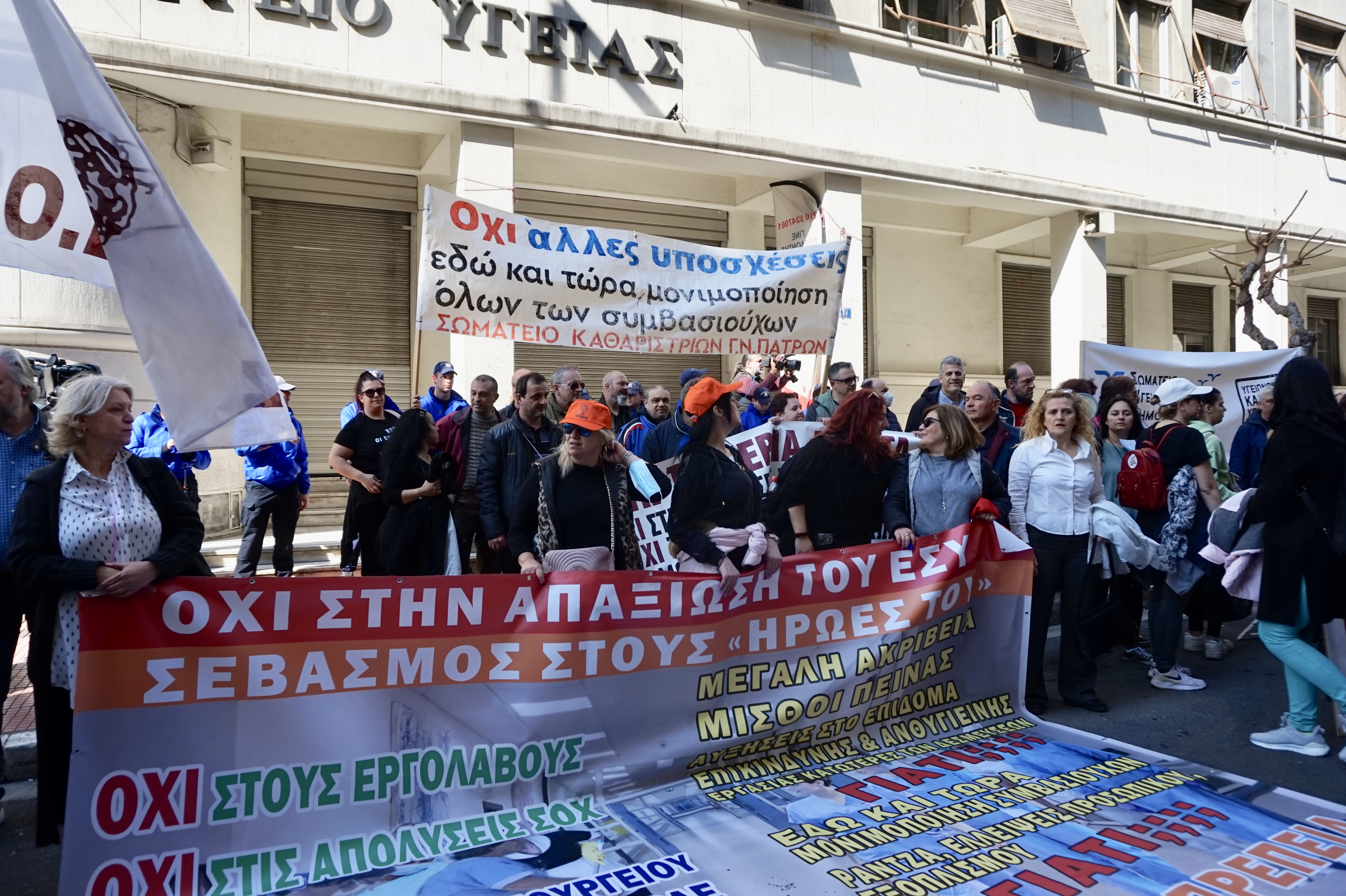 Νοσοκομειακοί στο Υπουργείο Υγείας σήμερα Τετάρτη πρωί ενάντια στις απολύσεις και κλεισίματα νοσοκομείων, για την άμεση επιστροφή στις δουλειές τους όλων των εργαζομένων σε “αναστολή”, για τη μονιμοποίηση όλων. (Φωτο Ε.Α.)