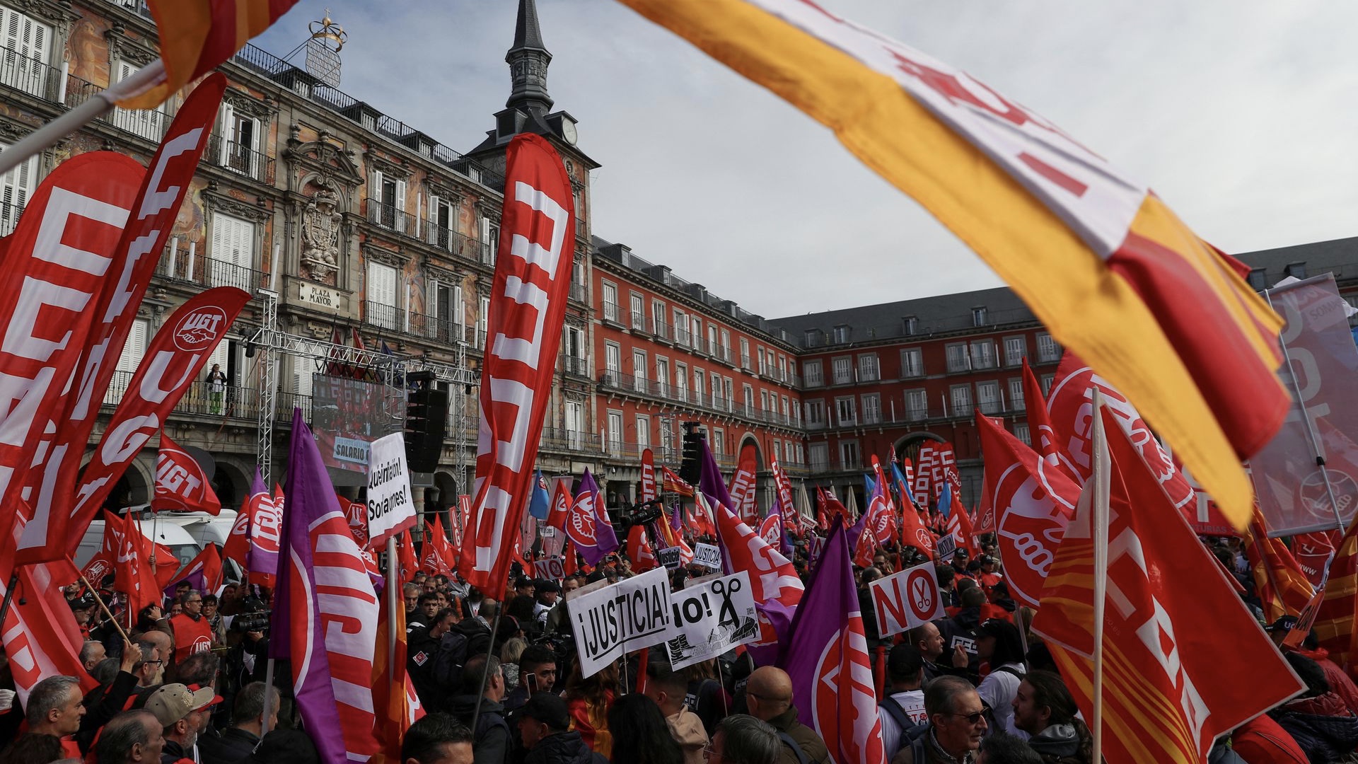 Χτες Πέμπτη στη Μαδρίτη δεκάδες χιλιάδες εργαζόμενοι συμμετείχαν στην απεργιακή πορεία που κάλεσαν οι δυο κύριες εργατικές ομοσπονδίες CCOO και UGT για αυξήσεις στους μισθούς πάνω από τον πληθωρισμό με κύριο σύνθημα «Μισθοί ή Σύγκρουση»!