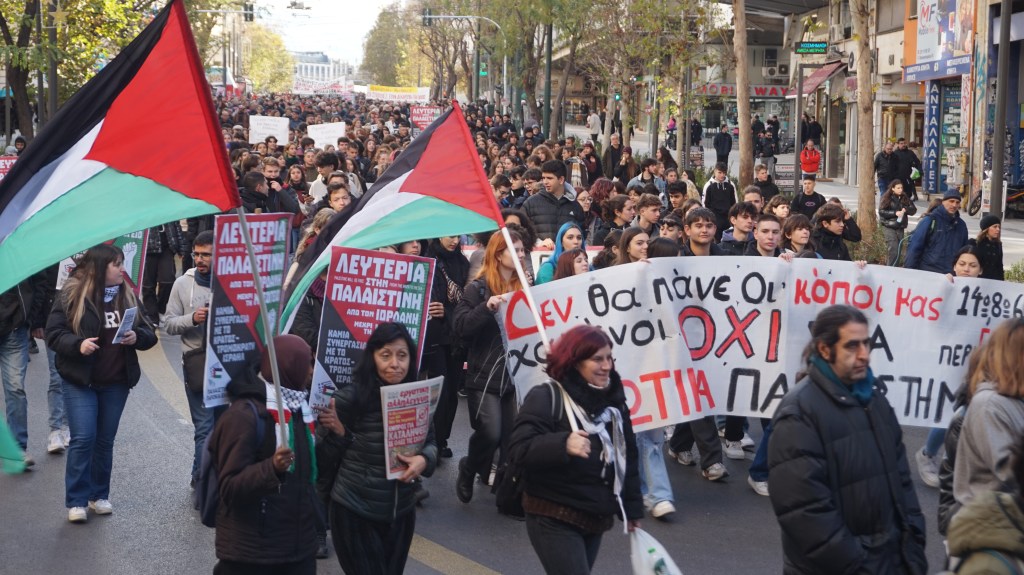 Από τη φοιτητική-μαθητική πορεία στην Αθήνα 25/1 ενάντια στα ιδιωτικά πανεπιστήμια. Η νεολαία υποστηρίζει την Παλαιστίνη είναι ενάντια στους πολέμους του Ισραήλ και ενάντια στους σχεδιασμούς της χούντας Μητσοτάκη για πολέμους στην Ερυθρά Θάλασσα. Ναύτες και αξιωματικοί έχουν αρνηθεί να υπηρετήσουν τους πολέμους του ΝΑΤΟ! (Φωτο Ε.Α.)
