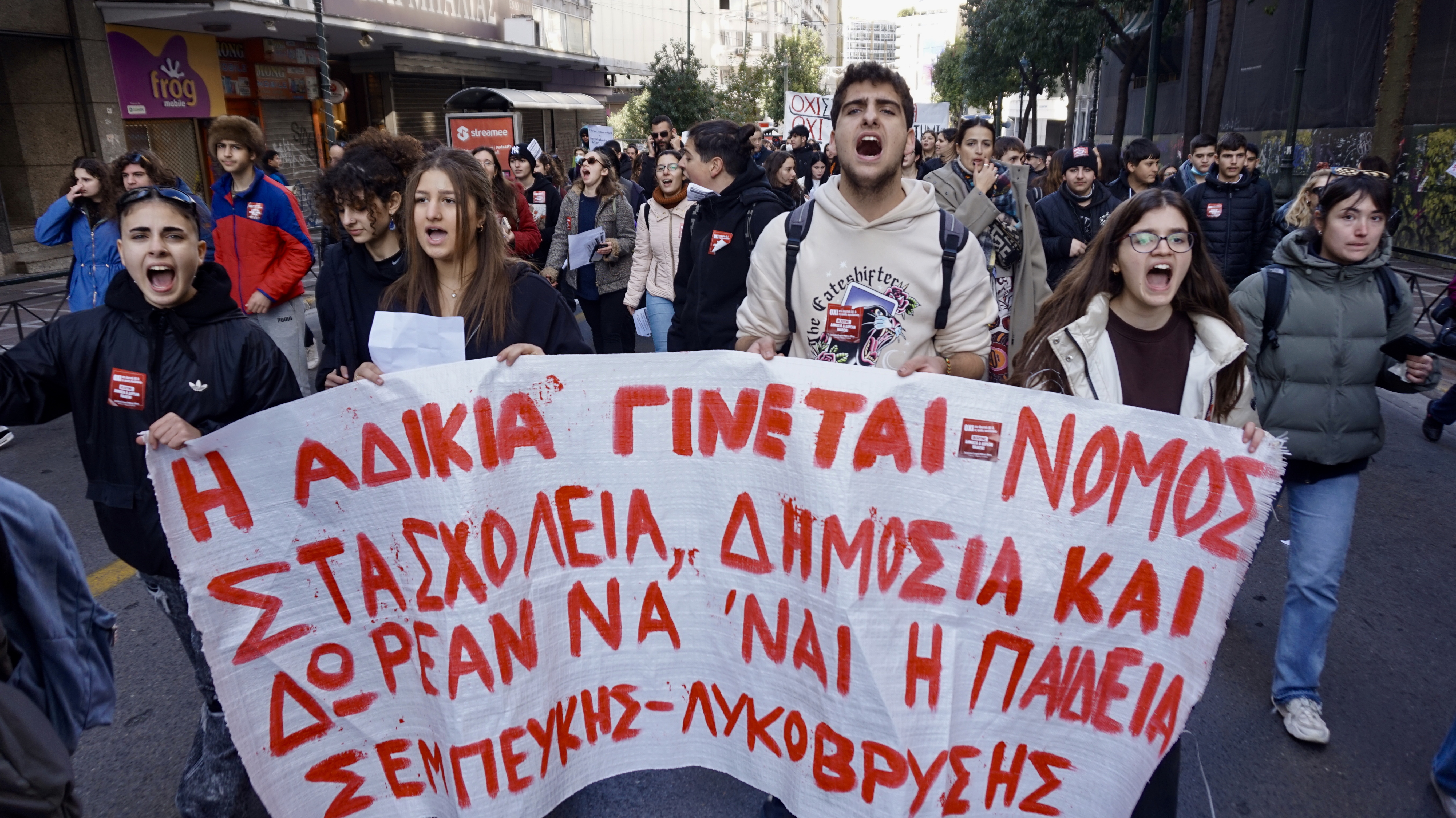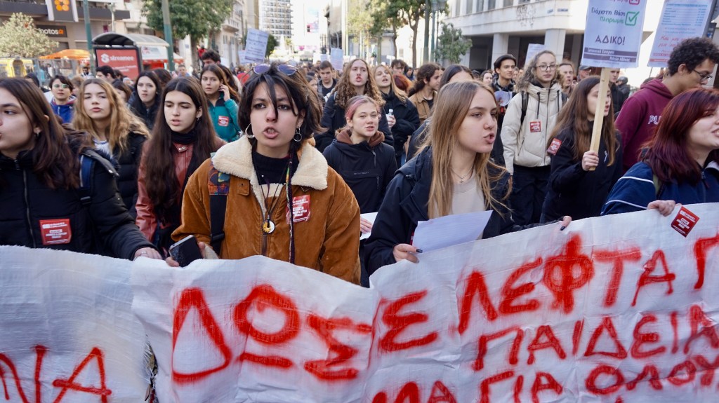 Στη χτεσινή πορεία τα πιο πολλά συνθήματα ήταν ενάντια στα ΜΑΤ του Μητσοτάκη, ενάντια στα ιδιωτικά πανεπιστήμια, υπέρ των καταλήψεων και του αγώνα στους δρόμους.
