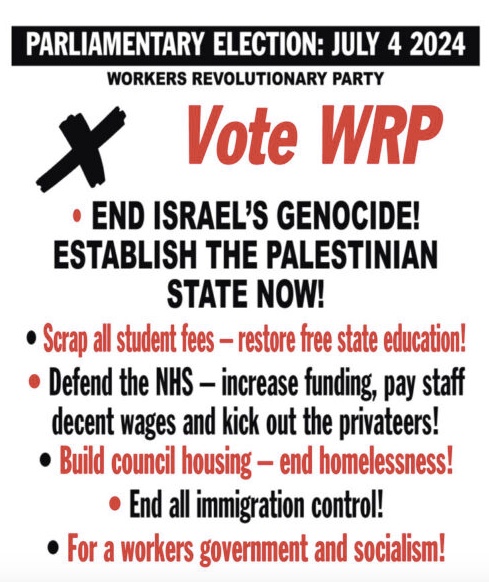 Το εξώφυλλο του Εκλογικού Μανιφέστου του κόμματος WRP, Βρετανικού Τμήματος της Τέταρτης Διεθνούς. Το WRP κατεβάζει 5 υποψηφίους σε εργατικές περιοχές του Λονδίνου, Λίβερπουλ και Οξφόρδης. Εκεί που δεν υπάρχουν υποψήφιοι του κόμματος, το WRP καλεί σε υπερψήφιση του Εργατικό Κόμματος ενάντια στους Τόρις και τους ακροδεξιούς ρατσιστές.