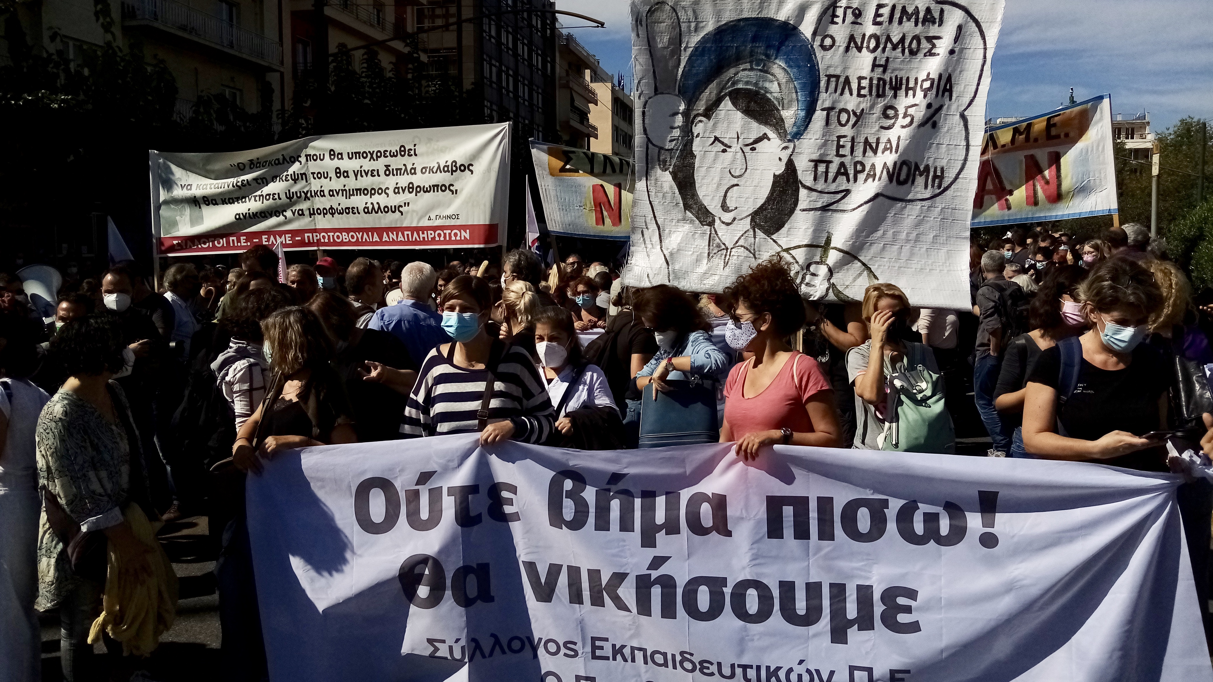 Εκατοντάδες εκπαιδευτικοί από συλλόγους πρωτοβάθμιας και δευτεροβάθμιας εκπαίδευσης πραγματοποίησαν μαχητική απεργιακή συγκέντρωση στα Προπύλαια και πορεία στη Βουλή την Παρασκευή (21/3) μεσημέρι ενάντια στις χιλιάδες διώξεις εκπαιδευτικών και τής επίθεσης στο δημόσιο σχολείο από το Υπουργείο Παιδείας τής κοινοβουλευτικής χούντας Μητσοτάκη.