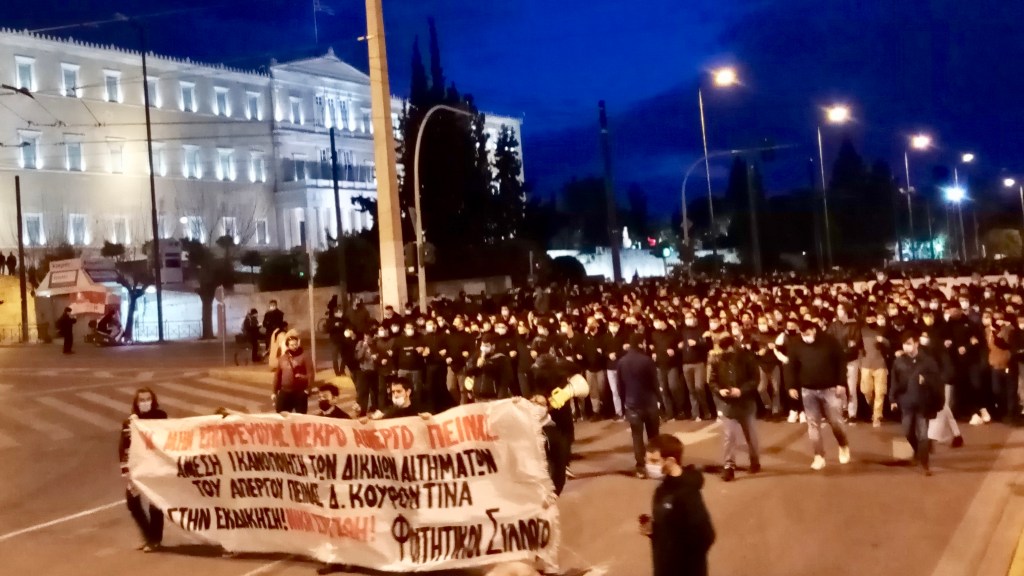Με μια μαχητική πορεία σχεδόν 2.000, σήμερα Σάββατο στην Αθήνα, νεολαία και εργαζόμενοι απαίτησαν την ικανοποίηση της διεκδίκησης του πολιτικού κρατούμενου Δ. Κουφοντίνα ο οποίος βρίσκεται σε κρίσιμη κατάσταση στη ΜΕΘ του νοσοκομείου Λαμίας.