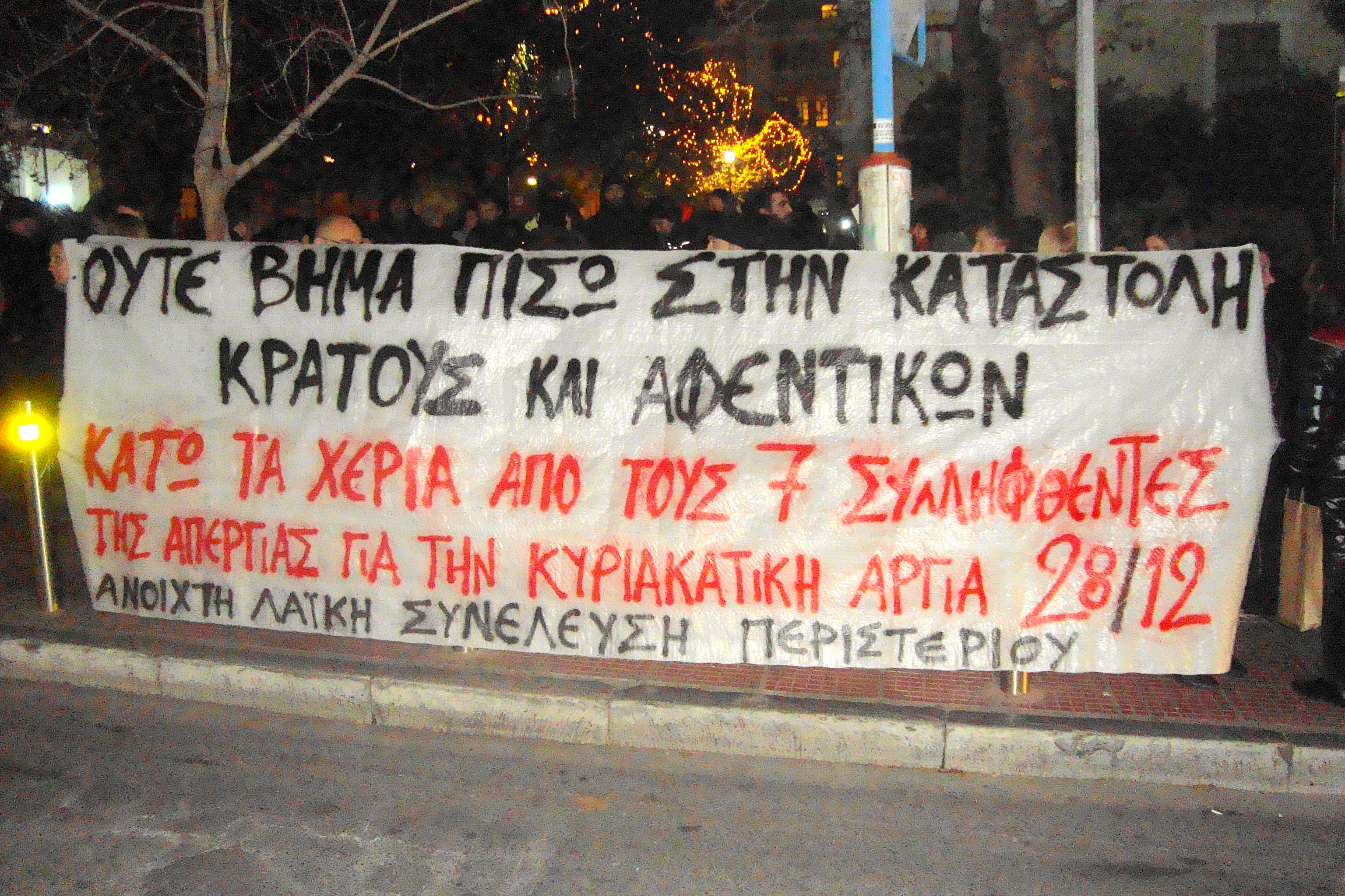 Μπροστά στη δίκη – σε β’ βαθμό – των 2 συλληφθέντων συναδέλφων μας στην απεργιακή συγκέντρωση έξω από το βιβλιοπωλείο “Ιανός” την Κυριακή 28/12/14 προχωράμε σε: